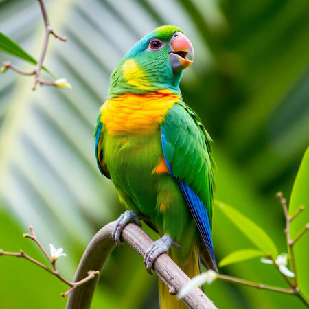 A colorful parrot rests on a branch surrounded by lush greenery, showing its vivid feathers in a vibrant tropical rainforest habitat.