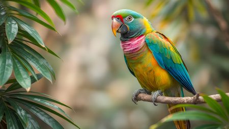 A vibrant parrot with blue, yellow, and green plumage perches amidst verdant foliage. The image displays a detailed view of the bird with its distinctive beak. The naturalistic style, with soft lighting and blurred background, makes it suitable for ecological or educational applications and commercial use.