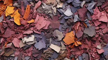colorful pieces of paper, resembling polychrome terracotta, are captured in a close-up shot. the vibrant hues of dark violet and gray create a visually striking contrast. these disintegrated fragments, reminiscent of the new fauves movement, are made from rubber. the artist behind this environmental installation employs a naturalistic color palette, resulting in a captivating composition. ai generated