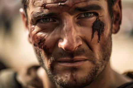 close-up of gladiators face, with the determination and focus to win the battle, created with generative ai