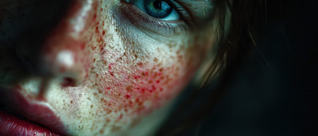 A person with striking blue eyes and prominent freckles gazes intensely highlighting skin texture and colors in dramatic lighting.