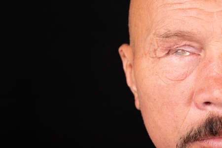 Close-up of a man's face with the consequences of glaucoma, dry eyes. Selective focus.