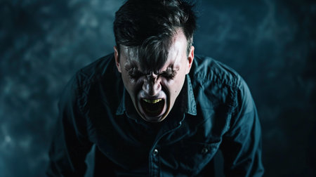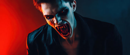 A figure with an intense expression showcases sharp fangs and dark makeup in a dramatic atmospheric setting with red and blue lighting.