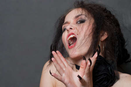 Halloween horror. Crazy bloody scary vampire girl with fangs screaming on black background