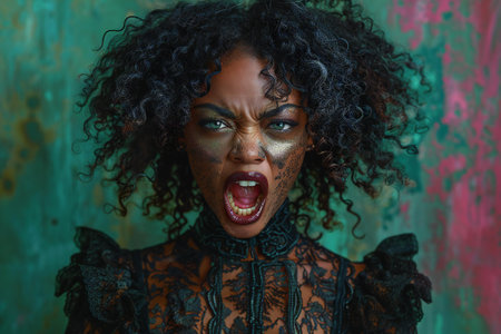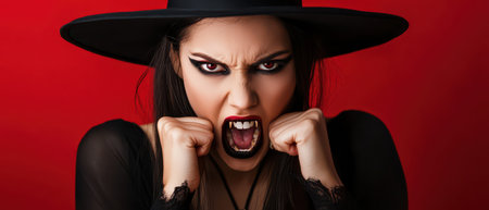 A woman with fangs wearing a witch hat displays fierce emotions against a vivid red background embodying a Halloween theme with dramatic makeup.