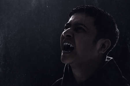 Extreme close-up of a menacing vampire's face with visible sharp fangs, pale skin, and intense eyes in dark, moody lighting. High quality photo