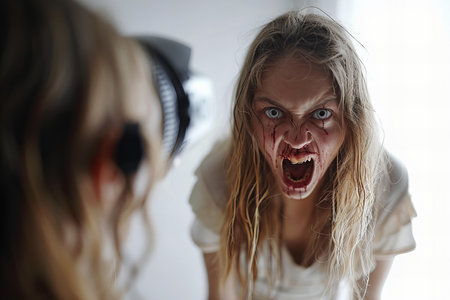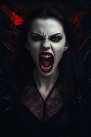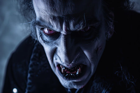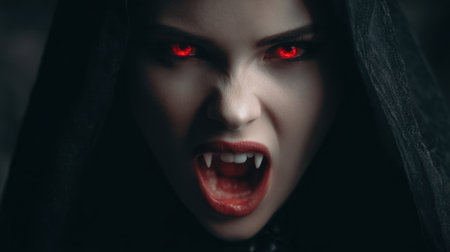 Close-up of menacing vampire with sharp fangs, piercing red eyes, horror-themed.