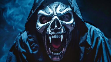 A chilling reaper with an open mouth and fearsome teeth invokes terror in a dark setting, embodying the spirit of Halloween.