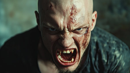 The thug, marked by intense anger, showcases battle scars and a fierce expression while shouting, creating a tense atmosphere in the dark setting.