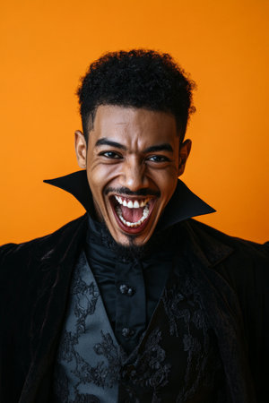 Brazilian young adult man dressed as a vampire with a wide, happy grin, posing against an orange background.