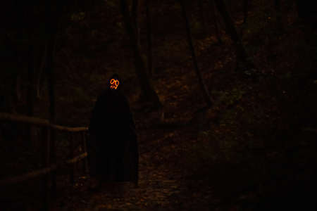 Scary man with devil mask stand by pumpkin lantern and light up candle in park at night. Halloween party costume and mask.