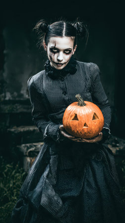 A child dressed in a spooky costume stands in a dimly lit area holding a carved pumpkin with a surprised expression perfect for Halloween.