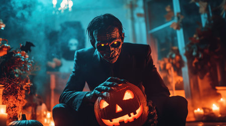 Generative AI : happy Halloween bearded man in a Dracula vampire costume with a pumpkin in dark home