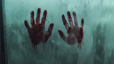 Bloody handprints on fogged glass in a dimly lit room create a chilling atmosphere of suspense and fear