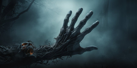 Halloween theme: terrible zombie hand in a spooky dark forest