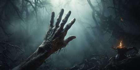 Decaying vampire hand, withered by daylight, reveals a tale of ancient curses and doom. Created with generative AI tools