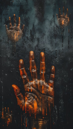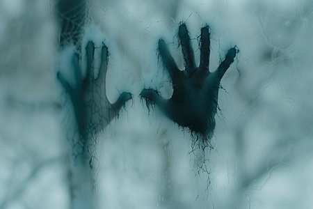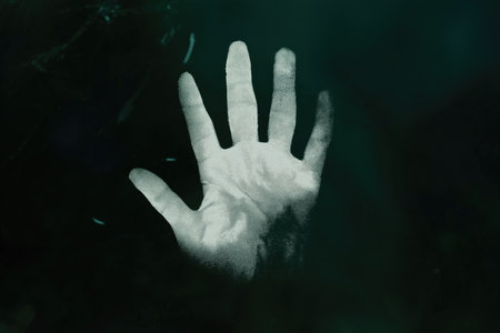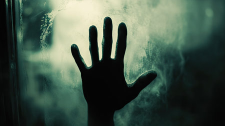 A haunting silhouette of a hand pressed against foggy glass creates a captivating atmosphere filled with mystery and intrigue, inviting viewers to explore emotions.