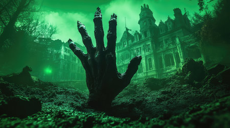 A zombie hand clawing out of the ground, lit by eerie green light, with a haunted mansion looming in the background.