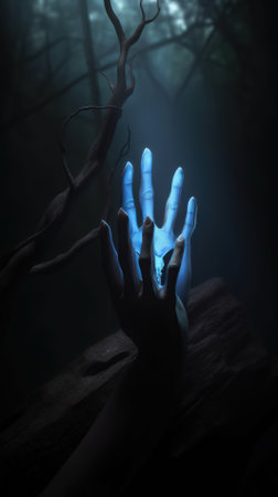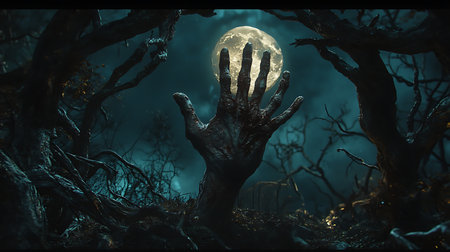 A chilling image of a hand emerging from dark soil under a glowing moon, evoking themes of mystery and the supernatural, perfect for horror concepts.