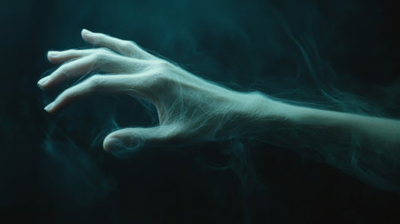 Ghostly hand reaching out of the dark, covered in smoke