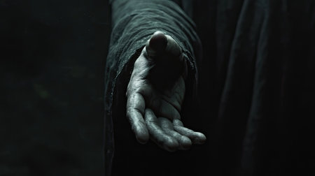 Dark scene of grim reaper extending hand toward camera, ominous and captivating image with dramatic lighting.