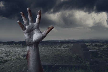 Zombie hand with blood and wound raised from the graveyard