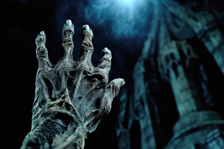 A close - up photography showcasing a zombie hand rising from a graveyard on a spooky Halloween night. Generative AI