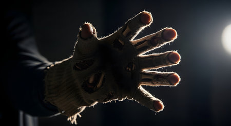 A person's hand is shown wearing a torn, dirty glove, revealing fake wounds or zombie-like decaying flesh underneath. The hand is held up in a dark, moody setting with a single spotlight. This image is perfect for Halloween, horror, or zombie costume concepts.