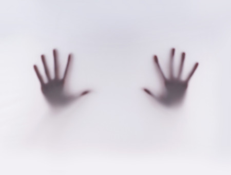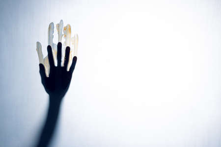 Shadow of hand the white frosted glass representing dangerous, fear, help, horror and scary.