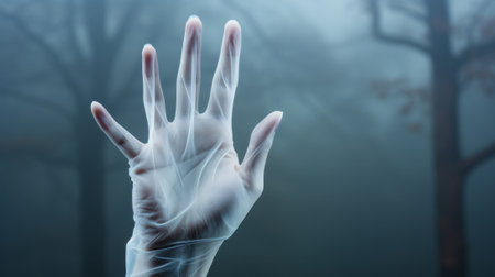 Amidst the winter fog, a solitary figure braves the cold with a hand in a transparent glove, a symbol of vulnerability and strength in the great outdoors