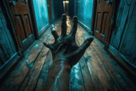 A hand, shrouded in darkness, extends from the shadows of a hallway, seeking connection.