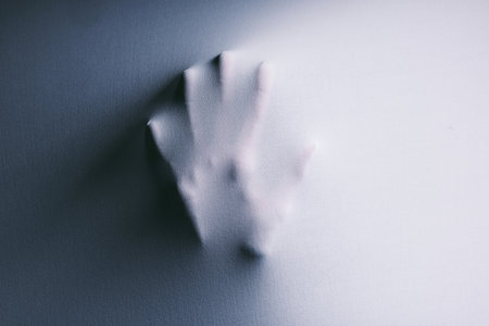 Hand shadow on frosted glass, closeup of two hands reaching out from behind the foggy white wall, blurry background, halloween concept, soft light and shadow effects, focus on hand shape, blurred edges for depth effect, minimalist style.