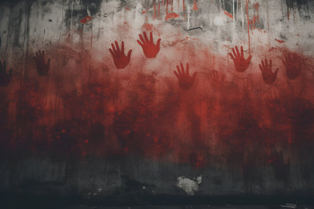 Bloody hands on the wall of an abandoned building, conceptual image