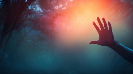 Silhouette of a man's hand in a dark forest.