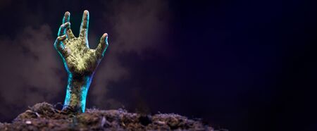 Creepy zombie hand on dark background with copy space. Halloween concept