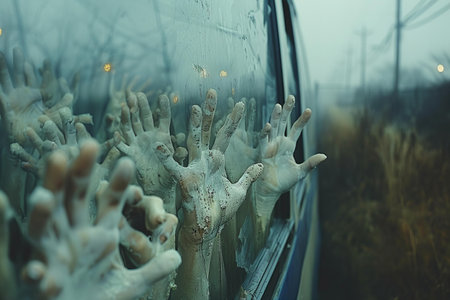Dark silhouettes of zombie hands reaching and scratching at fogged glass create a haunting visual. The mist and blue tones add to the eerie atmosphere, evoking suspense.