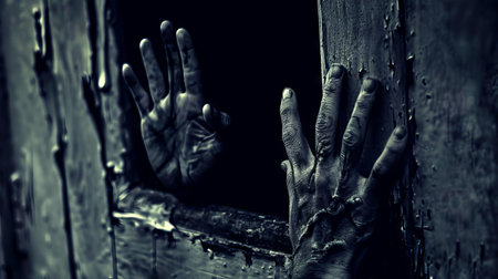Hands pressing against a weathered window. Concept of Halloween, thriller, horror, desperation, seeking help, isolation, human emotion.