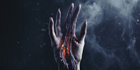 Decaying vampire hand, withered by daylight, reveals a tale of ancient curses and doom. AI Generative