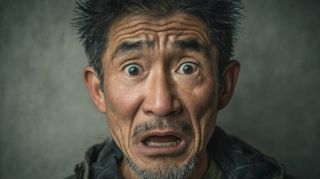 Close-up portrait of a mature man expressing surprise, with wide-open eyes and an anxious mouth, revealing feelings of fear and disbelief