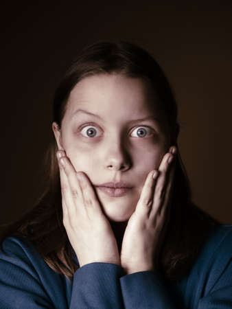 Portrait with a red treatment of a teenager on a black background. Concept of pain and tension.