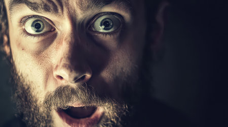 A man with a beard displays a shocked expression eyes wide open captured in low light conditions evoking strong emotions.