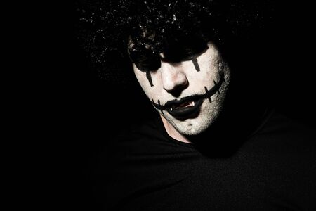 Closeup photo shoot of spooky girl with evil clown makeup at dark photo studio.