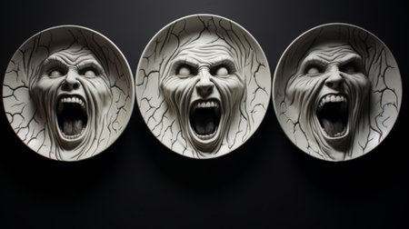 a porcelain wall hung piece featuring screaming faces, inspired by the style of necronomicon illustrations. the carving creates an illusion of three-dimensionality, enhanced by the emotive use of light and shadow. captured with the tokina at-x 11-16mm f/2.8 pro dx ii and zeiss batis 18mm f/2.8 lenses, this porcelain artwork is a captivating blend of artistry and craftsmanship. ai generated