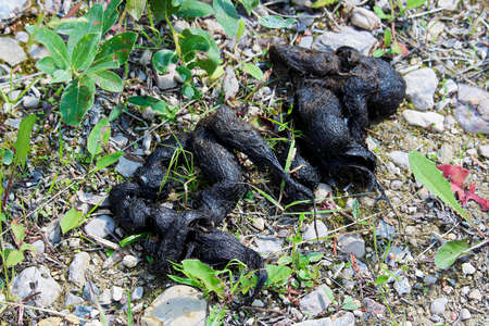 Dog feces on the cement ground at a roadside. Close up dog shit