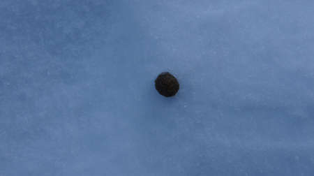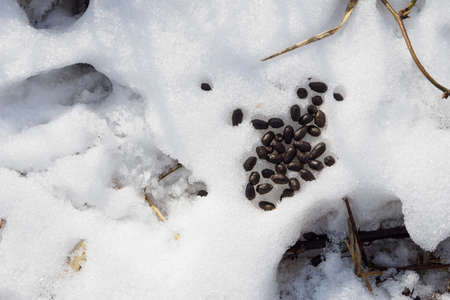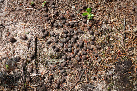 Cluster of oval-shaped Roe deer (Capreolus capreolus) droppings (poo) on the ground. Animal dropping in nature