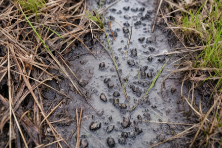 This image presents a close-up of animal dung on cracked, dry earth. The scene is dominated by brown and beige tones, with rough textures evident on both the dung and the ground. The overhead lighting suggests a daytime setting. It can be suitable for illustrating themes related to nature, environment, or agriculture.