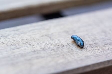 Farmer crushing colorado potato beetles with shoe on concrete floor
