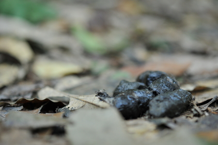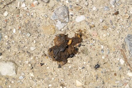 Fresh elephant dung on a gravel road in a national park with living organisms and dung beetles