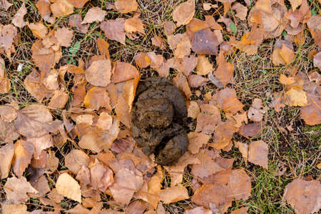 Pile of fresh horse droppings or manure on a forest pathway. Low angle shot, autumn morning, no people.