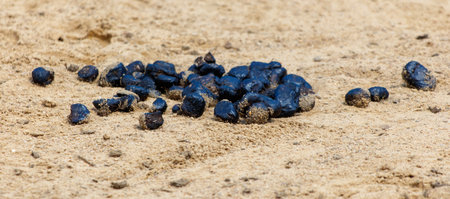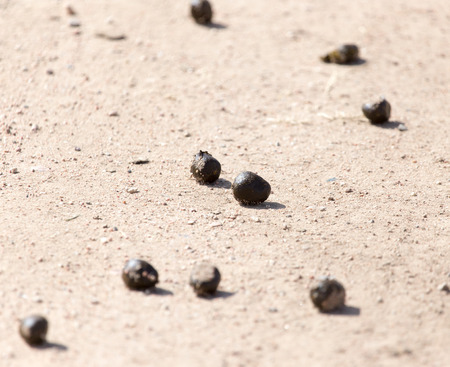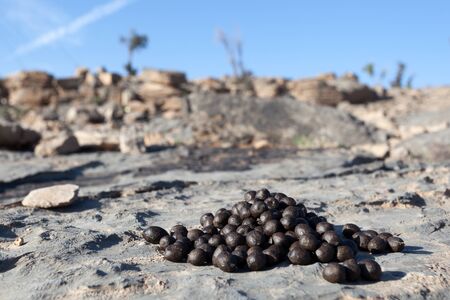 Close up black color goat excrement droppings on a rock. Oman, Middle East